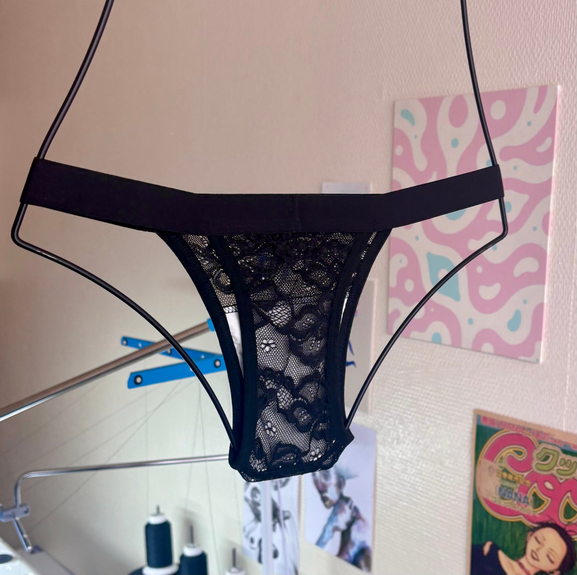 J’ai l’honneur de te présenter mon modèle de string sans tuck, fait pour habiller notre intimité, mais sans la compresser, parce qu’en 2025, on devrait pas avoir à choisir entre un dessous pour les femmes cis qui ne correspond pas à nos spécificités ou un dessous compressif, alors que parfois, on a pas envie d’être compressée!